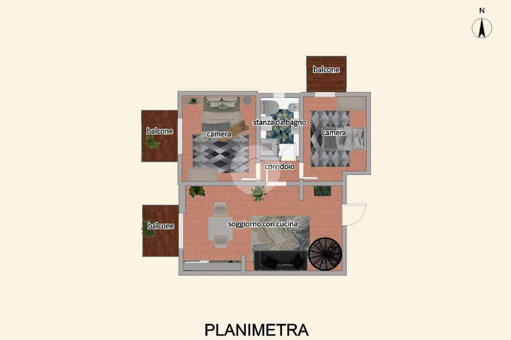 Internamente l'immobile si compone di ingresso in ampio soggiorno con angolo cottura e balcone, due camere matrimoniali con balcone e bagno finestrato con doccia. Tramite una scala interna si raggiunge la mansarda di ampia metratura.