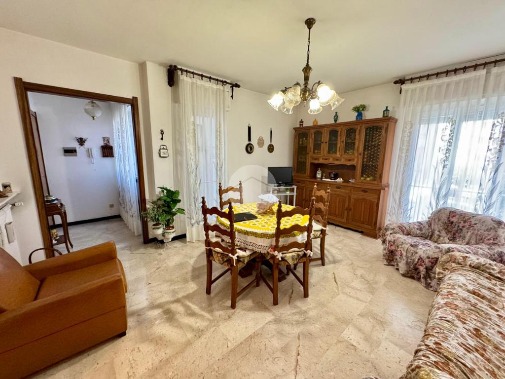 L'appartamento internamente è composto da ingresso, ampio soggiorno, cucina con comodo ripostiglio, due camere matrimoniali, bagno finestrato con vasca e balcone. Pavimenti in marmo travertino ed infissi in legno.